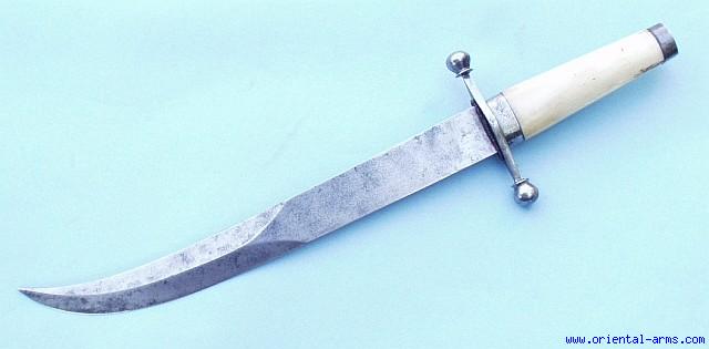 Unusual Dagger with Slightly curving, heavy 10 inches blade, sharpened on both edges on its lower part only. Bone grip with steel pommel and steel collar and with steel cross guard with steel balls quillons. Total length 14 inches. Probably European, 19 C. Very good condition. No scabbard. |