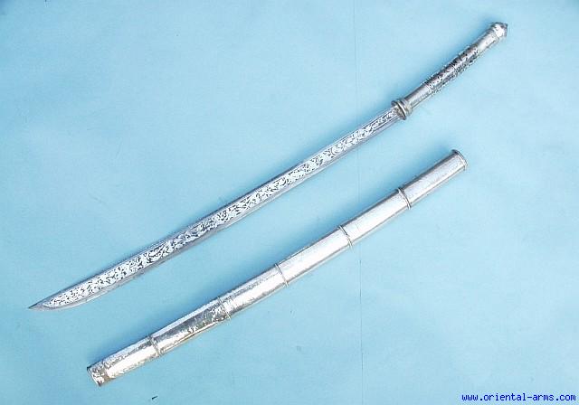 Up for sale is this beautiful Burmese Dah Sword, With a heavy blade, 25 inches long, entirely inlaid with silver koftgari decoration of human figures and animals and inscription in Burmese. Also the spine is set with silver decoration. The long 10 inches grip is entirely covered with silver and finely decorated in a similar style on black background. The wood scabbard is entirely covered with silver. Total length 36 inches. Very good condition. Minor damage to the silver near the scabbard tip. A fine sword of quality. |