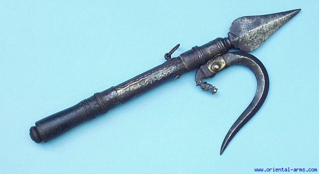 This is an Indian ANKUS, (Elephant Goad), used by the Indian to guide their elephants. Although it is not a pure weapon, it is always shown in Museum and private collection in connection to Indian arms and armor. It also finds extended use as a ceremonial item displayed in parades and other important events. This one is of a very early one, early 18 C. Or earlier. Good quality. Heavy leaf shape blade 6 inches long and 2 ½ inches wide. Heavy steel hook 7 inches long and 5/8 inches thick at its base. A steel animal figure with a brass eye is forged in one piece at the tail of the hook. Wood haft, 15 inches long, partially covered with brass and with heavy steel fittings. Very good condition considering its age. Nice age patina on all steel parts. Unusual and original piece and a very interesting addition to any Indian art / or edged weapon collection. |