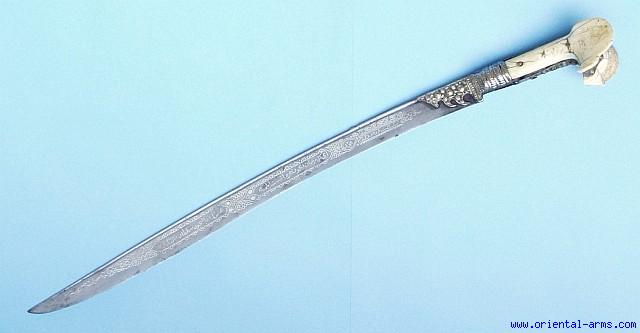 Up for sale is this fine example of a Balkan Yataghan sword. Typical down curving blade, 22 ½ inches long, entirely inlaid with silver (true inlay) of inscriptions in Arabic letters on both sides, signed and dated to 122 in the Islamic calendar (1220 as the zero is sometime omitted). This refers to 1805 in the Gregorian calendar. The handle is composed of two massive grips slabs carved from walrus ivory with the classical huge pommel ears. The bolster and grip strap are made from gilded chased silver and set with small coral stones. Total length 28 inches. Very good condition . Few age cracks on the ivory. Old repairs and minor damages on the grip strap. Few coral stones are missing. |