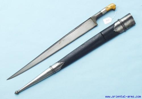 A very good Khayber sword from the area of the Khayber pass between Afghanistan and Pakistan. It is characterized by the single edge heavy blade with pronounced “T” shape spine. This specimen is of very good quality, with Indian wootz (Crystalline) steel and Ivory grips. The hilt bolster and the grip strap are also made from high quality wootz. The original scabbard is covered with black leather and mounted with steel fittings.