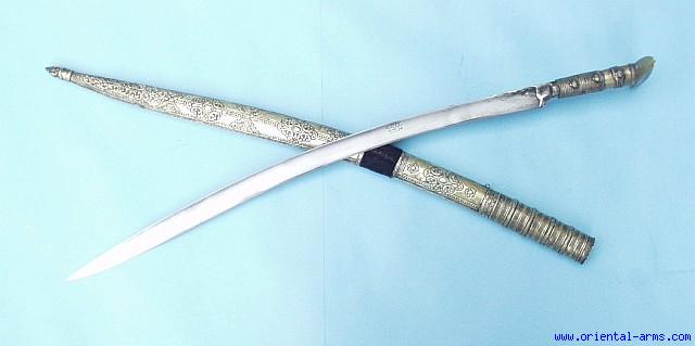 Up for sale is this big and unusual Turkish Yatghan. The blade is 27 inches long, forged from laminated steel with hardened edge and spine. It is dated to 1224 (1809 in the Gregorian calendar). The mountings are later to the blade, probably late 19 C, and made from beautifully chased and engraved white metal. The handle is of special interest with very long side ears 5 inches tip to tip with the grip bound with twisted silver wires. Total length 35 ½ inches. Very good condition. Unusual piece. |