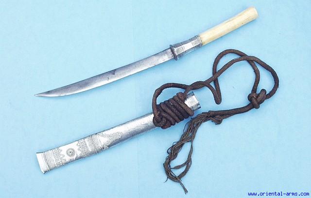 Up for sale is this fine Dah short sword / agger, with a slightly up-turning single edge and heavy blade. 7 ½ inches long solid ivory hilt with good age patina and nicely decorated silver collar. Silver covered scabbard. This Dah comes with its original baldric cotton belt. Total length (In scabbard) 21 inches. Very good condition |