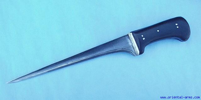 This Karud dagger is the straight back member of the family of the Pesh-Kabz, Choora and Khyber Knife. The whole family of such daggers is common to India, Persia and several Central Asian countries. The blade is forged from beautiful high contrast wootz (Damascus) steel, 10 inches long, heavy, with a pronounced T spine tapering to an acute tip. The grips are Rhino horn with a pronounced fibrous structure cut axially to the horn. The grip strap and bolsters are steel. The very typical horn grips indicate a Bukhara origin. Very good condition. No scabbard. |