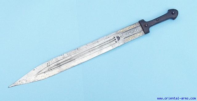 Up for sale is this big and massive Qama Dagger. Most probably Persian or Central Asian origin. The multi fullered 2 inches wide, 19 inches long blade has a clear marker stamping and Arab inscription with the date 1319 ( 1901 in the Gregorian Calendar). It is also decorated with gold koftgari decoration. Horn grips riveted to the blade tang. Total length 25 inches. Very good condition. Minor blackened spots on the blade. No scabbard. Very attractive price. |