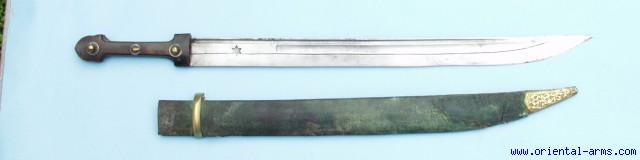There are a lot of debates regarding the exact name of this type of dagger / short sword. Some people call it “QAMA”, other call it “QUADARA”. These names also applies to other - similar but not exactly the same - weapon. I prefer to call it a “Single edge Kindjal”. It origin is certainly in the Caucasus region. It comes in various sizes, up to 30 inches, and in a variety of quality and materials. This specific example has a single edge blade, 23 inches long. It has three fullers on one side and two on the other. The wide ones are etched with a floral design. There is a clear Islamic maker sign in the shape of six point star (Star of David) deeply stamped into the blade. The grips are of black horn, riveted to the blade tang with brass rivets and rivet disks made from old silver coins. The scabbard is wood covered with the original green dyed leather and mounted with a chased brass tip. The ring attachment is also brass. Total length is 31 plus inches. Some pitted areas on the blade and few small chips from the grip horn. The leather cover of the is worn and slightly loosed and damaged at the tip. The brass tip is dented. Otherwise, all in very good solid condition, considering its age. It is a very interesting addition to any Caucasian or other edged weapon collection. |