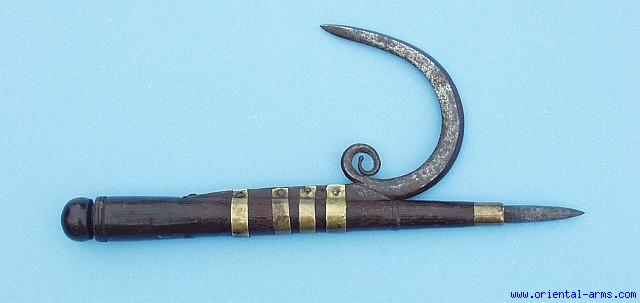 This is an Indian ANKUS, (Elephant Goad), used by the Indian to guide their elephants. Although it is not a pure weapon, it is always shown in Museum and private collection in connection to Indian arms and armor. It also finds extended use as a ceremonial item displayed in parades and other important events. This one is a very early speciman, late 18 C. or earlier. Good quality. Heavy spiral shape side blade 5 ½ inches long, forged in one piece. 2 ½ steel spike. Wood haft, 15 inches long, partially covered with brass bands. Very good condition. Nice age patina on all steel parts. Unusual and original piece and a very interesting addition to any Indian art / edged weapon collection |