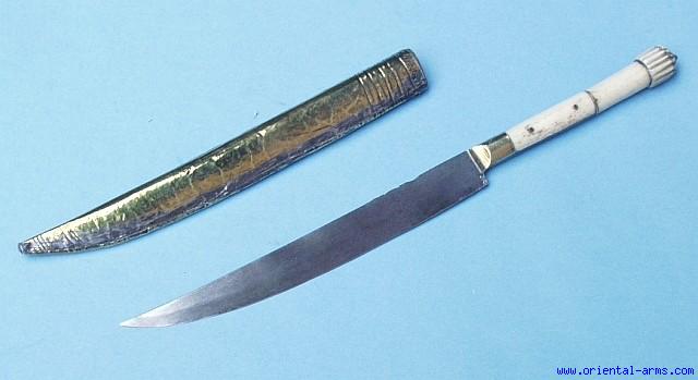 A very typical knife from Bosnia & Hertzegovina, from the very short period of independence before the annexation to the Austro-Hungarian Empire. The blade is straight, single edge, 8 inches long, unmarked. The handle is of unusual shape, bone grips with brass separators and nicely carved pommel. The scabbard is wood covered with thin brass. Very good condition. Very attractive price. |
