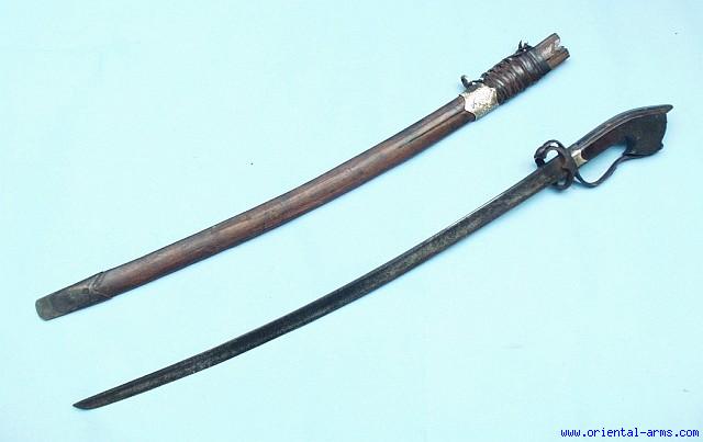 A very unusual and interesting Arab sword, also known as Saif. It reminds the famous Moroccan Nimcha, but although the hilt style is similar, this sword is coming from the Arabian peninsula, and it is believed to be produced in the island of Zanzibar in the 19th C. The single edge blade is fullered and slightly curved 27 inches long with a short 6 inches false edge. Probably a secondary use of a European cavalry sword blade. The grip is cut and beautifully shaped from a solid piece of dark horn and set with a silver collar. The unusual design of the hilt is attributed to swords produced in Zanzibar, and has a big steel ring forged in one piece with the cross guard and the “D” guard. This sword comes with its original wood scabbard bound at its top with a long leather strip and an engraved silver ring band. Copper tip. Total length is 37 inches. Good condition. Blackened blade with good patina and minor nicks. The hilt ring is cracked. The scabbard copper tip is a later replacement. . An un-common good sword. |