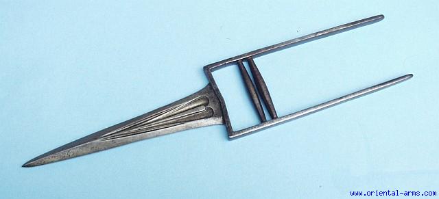 Nice Armor piercing Kattar Dagger. Heavy, 8 ½ inches fullered blade with thickened armor piercing tip. May very well be a wootz (Damascus) steel. 8 inches side bars with two cross bars Very good condition. Good aga patina on the blade.