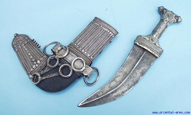 A very fine and good quality Arab Jambiya dagger from Oman. It has a 7 inches curved and dual edge blade with a pronounced central rib. The hilt is made of white metal heavily decorated with silver decoration. The scabbard is “L” shaped covered with leather. The belt attachment is made of complicate arrangements of silver rings and twisted silver wire. All scabbard and hilt fittings are silver with filigree and granulation decoration. Very good condition. This is an item of high quality and in very good condition, a good typical piece for the advanced collector of Arabic weapons / art. |