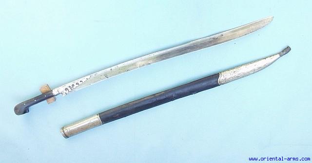 Up for sale is this very nice and complete Yataghan sword. A classical down curving blade, 27 inches long. Forged from patern welded ( Damascus) steel and marked with a maker sign. The spine of the blade near the bolster is inscribed in Arabic lettering and dated on the spine to 1224 (1809 in the Gregorian Calendar). The hilt is black horn and the grip strap and bolster are silver. The scabbard is wood, covered with black leather and mounted with engraved white metal locket and chape . Total length 35 inches. Good condition. |