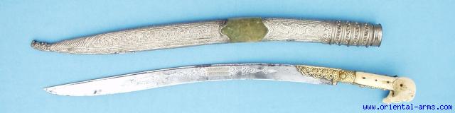 This is a big and very impressive Turkish Yatagan dated to 1273 (1858). The blade is 25 inches long, down curving with the edge on the concave side. It is inlaid with gold and silver koftgary work with the date and inscription in Arabic. The grips are carved from big pieces of walrus ivory in the classical form with big side ‘ears’. The grip strap is gold plated silver. The scabbard locket and chape are chased silver. Good condition, minor pitted spots on the blade A small hardly noticed crack and an old repair to the silver chape. A great piece. |