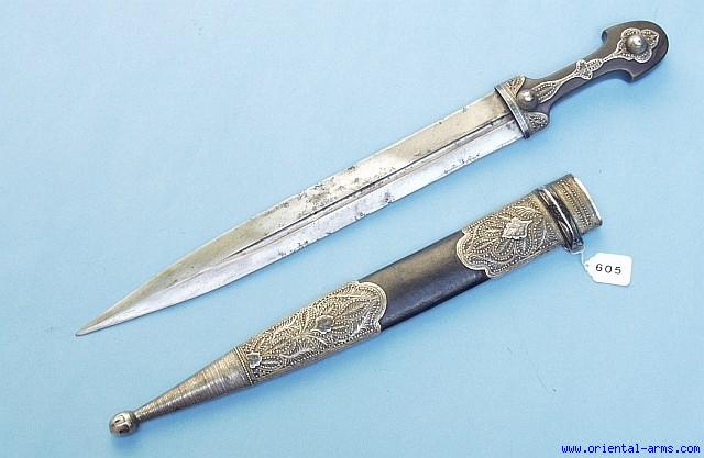 Right from our private collection we offer for sale a nice and good Qama / Kindjal dagger from Georgia. Classical double edge blade 15 inches long with deep off set fullers. Grip carved from a solid piece of horn and decorated with elaborate silver filigree work and niello design. The scabbard is mounted with big silver locket and chape, also heavily ornamented with filigree silver work on the front face and niello design on the rear face. The locket rear face is inscribed in Georgian (?) language also in Niello work. Original leather cover on the scabbard. Total length 21 inches. Very good condition with small pitted spots on the blade and minor edge nick. Good original item, late 19 or early 20C. in original condition. |