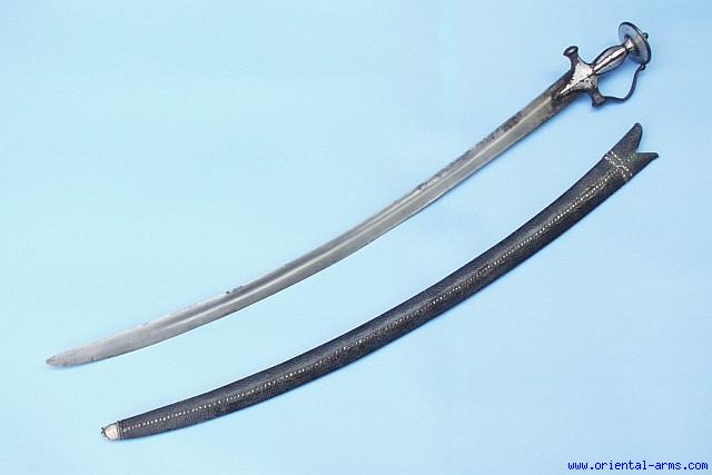 Fine heavy Tulwar sword with a fine wootz ( Damascus) blade 32 inches long with 9 ½ inches back edge. Steel handle covered with silver ( partially gone). Original scabbard with beautiful leather cover and silver stitches, with silver scabbard tip (slightly damaged). Very good condition. Spots of blackening and shallow pitted spots. Silver on handle partially gone. Scabbard rare and original. |