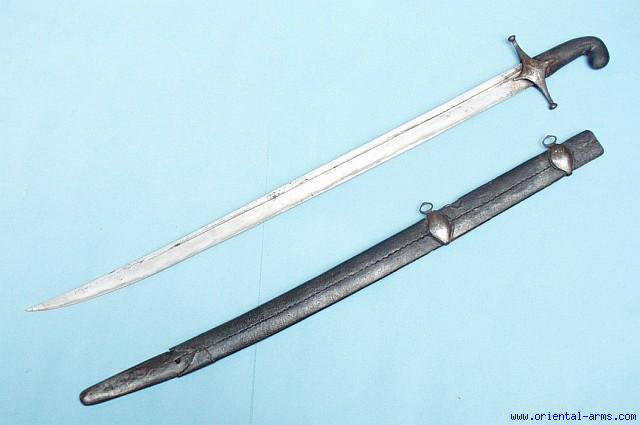 This one is a very interesting piece. Heavy very slightly up curving fullered blade, 31 inches long, light pattern welded steel and tempered edge. Wood grip with leather cover. Steel cross guard with brass decorated inlay. Wood scabbard with the original black leather cover and steel fittings inlaid in the same style as the cross guard. This sword is most probably of Georgian ( Caucasus) origin, early 19 C, 1820 or so. Total length (In scabbard) 35 inches. Good condition. Grip is a later replacements with leather losses and wood chips, partially painted to cover the leather losses. Scabbard tip loose. Scabbard leather worn, with light losses and open seams. |
