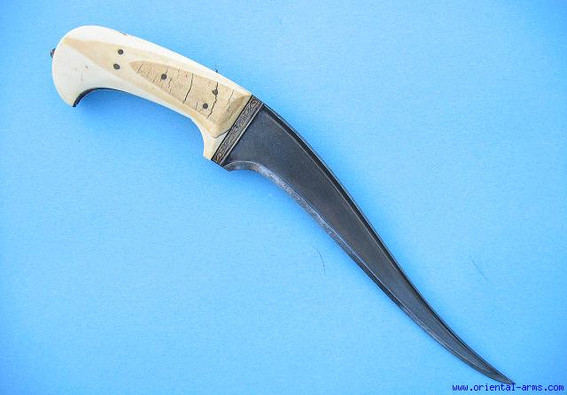 This superb dagger is a Pesh-Kabz , a member of the family of the Karud and a Khybar Knife, but with a re-curving blade. The whole family of such daggers is common to India, Persia and several Central Asian countries. The blade is of forged from persian wootz. 8 ½ inches long, heavy, with a pronounced T spine, reinforced edge and thickened armor piercing tip. The grips are of elephant ivory, the grip strap and bolsters are steel decorated with gold Koftgari work. Very good elegant blade shape a piece of quality.Total length 13 inches. very good condition, a small area of the gold is worn. A further etching will bring the pattern to its full beauty. |