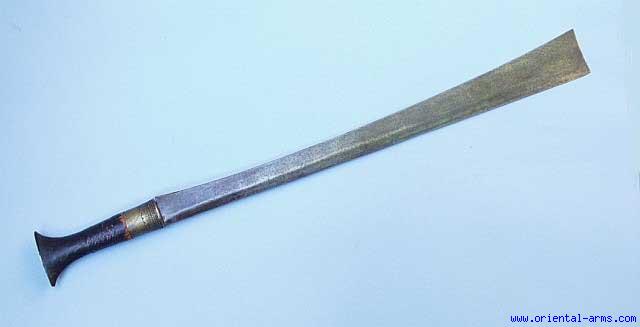 The Naga people of Assam (North-East India) and The Kachin people of Myanmar (Burma) uses this very efficient sword / cleaver. It has a very heavy blade, widening to maximum width at its very top. This one is a classical example. Deadly sharp beveled blade, 22 inches long, 3 inch wide at its tip. Wood handle bound with braided rattan dipped in black lacquer to give an excellent grip and bone mounted pommel plate. Total length 27 ½ inches. Very good condition. No scabbard. |