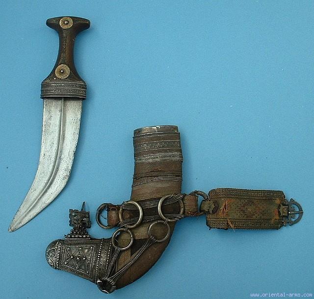 A good quality Arab Jambiya dagger from Oman. It has a 7 ½ inches curved and dual edge blade with a pronounced central rib. The hilt is made of Rhino horn with clear fibrous structure, in the classical “I” shaped, decorated with silver nails. The scabbard is “L” shaped covered with leather. The belt attachment is made of complicate arrangements of silver rings and twisted silver wire. All scabbard and hilt fittings are silver chased in a typical design. This item comes with one part of its original belt and the buckle. The other part of the belt is missing. Good condition. |