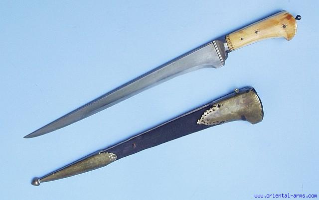 A fine and long ‘KARUD’ (the common name for a ‘Pesh-Kabz’ with straight blade). from North India or Afghanistan origin. A fine wootz blade almost 14 inches long with acute point and reinforced T spine. The grips are elephant ivory with a good age patina. The scabbard is original, wood covered with the original fabric and mounted with pierced brass fittings. Total length (in scabbard) 20 inches. Very good condition. Minor forging flaws on blade. The right grip has a small area of later fitted ivory piece. Small areas of the fabric on the scabbard are worn. A good high quality piece for the advanced collector. |