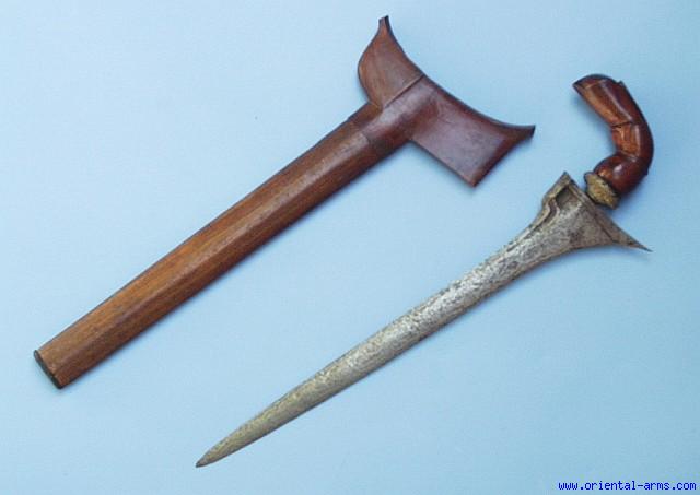 This Bugis Keris Dagger has a very old straight blade 14 ½ inches long, with clear pamor structure. The mendak is engraved brass. The hilt and scabbard are carved in a classical Sulawezi style and with horn tip. Good condition. Small and hardly noticeable repairs to the handle and the scabbard but otherwise all part original Very reasonable price for the quality. |