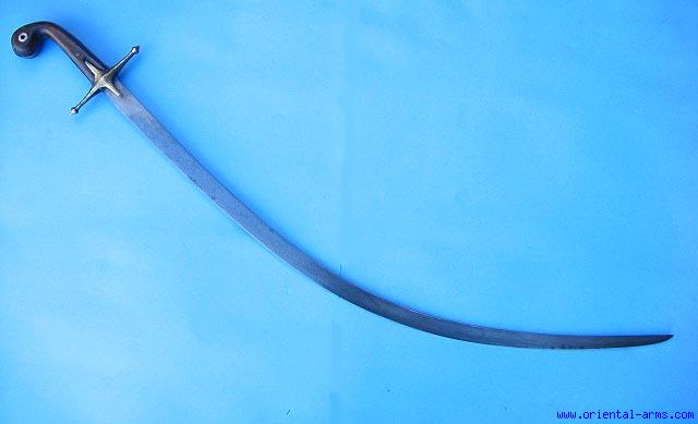 We offer here an Ottoman Shamshir sword. The light 30 inches blade is forged from a fine Persian wootz with high contrast clear pattern. The grips are of nice brown horn with a brass grip strap and brass cross guard. Total length 36 inches. Very good condition. |