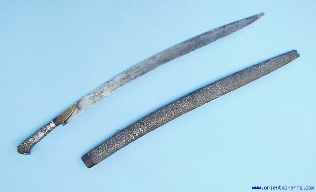 Up for sale is this rare Yataghan sword, with a handle in the shape found on knives and blades from Epirus, N.W Greece. The blade is 24 ½ inches marked with a maker stamp, the handle is chased silver with brass bolsters. The scabbard is wood covered with thin foil of chased silver. Fair condition. Unfortunately this Yataghan had seen its share in battle. The handle was struck by several hits from an opponent sword which left two clear cuts, with the third one probably cut deep into the handle, which required the repair by binding it with silver wire. Damaged silver scabbard with the scabbard mouth and tip missing. There were several repair attempt on both the handle and the scabbard, some of them crudely made. Sold as is at a very low price. |