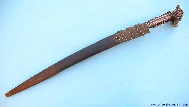 A fine classical “YATAGHAN” from the Balkan with a 21 1/2 inches long blade inscribed with silver inlay with Arabic letters and decoration and dated to 1226 in the Islamic calendar (1811 in the Gregorian calendar). The grips with the side ears are made from silver beautifuly decorated in a typical ottoman silver work for the period. The grip strap and the blade collar are set with 16 red coral stones. Black leather coverd scabbard with top silver mount and steel bottom tip. The steel tip is probabbly an old replacment. Total length almost 29 inches. This is a very good quality Yataghan of high quality silver work. |