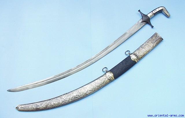 Up for sale is this very fine and heavy Arab sword. The heavy blade, slightly curved and fullered is 31 inches long, forged from light contrast Sham wootz (A Turkish / Syrian watered steel of very light contrast). The handle is of classical shape, horn grips decorated with lead stars and brass nails bound to the tang with silver wire. Silver grip strap and big silver pommel cap. The cross guard is steel and of Persian style. Wood scabbard with large and heavy silver locket and chape. Total length 37 ½ inches. Very good condition. One of the cross guard langets is partially broken. A fine heavy sword of quality. |