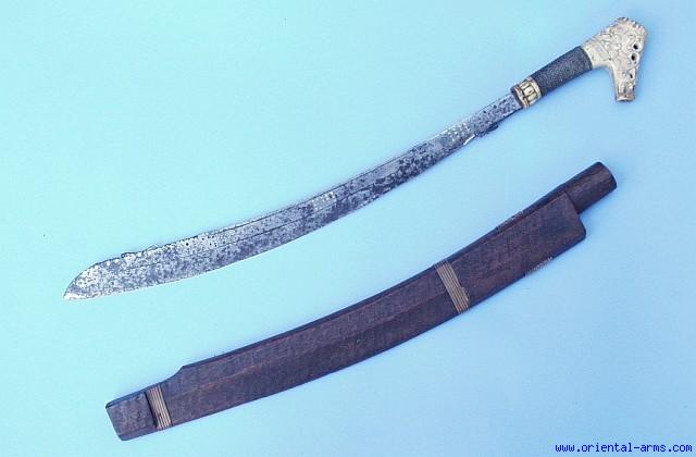 Although similar, this is NOT a Mandau. It is better known as Jimpul and it is used in the same regions and same people who uses the Mandau sword. Not like in Mandau, the blade is curved upward and has a symmetrical cross section. The hilt however reminds that of the Mandau. Both the Jimpul and the Mandau are coming from Kalimantan (Borneo) and both are associated with the head hunting tradition of the Dayak. This Jimpul has a heavy, up curving, 21 inches blade, filed and pierced tip, engraved on both sides and inlaid with brass nails. The handle is bone very elaborately carved, with a beautiful and big crown like pommel end. Wood scabbard bound with rattan bands. Good condition. Some blackened area with pitted spots. Few of the brass nails are missing. |