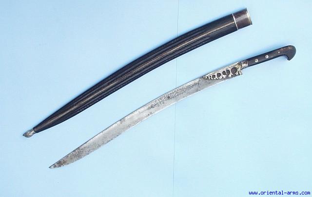 Up for sale is this good Turkish Yataghan, Classical shaped blade, 24 inches long, marked and inscribed in Arabic letters. Black horn grips with silver grip strap and bolsters. Wood scabbard covered with tooled black leather and mounted with silver locket and chape. Total length 32 inches. Good condition. Grips and grip strap restored. Leather cover is recent. |