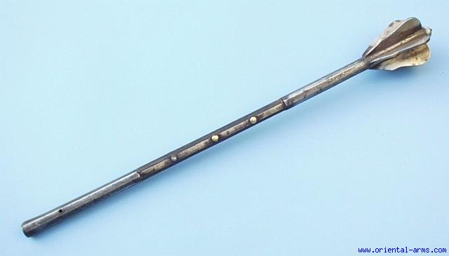 Up for sale is this late 19 C. Ottoman war Mace. A 4 inches tall head with six steel flanges mounted on a wood shaft 21 inches long. With upper and lower steel fittings decorated with silver koftgari work. The wood haft is covered with fabric and reinforced with a steel strip with brass tacks. Total length 25 inches. Good condition. Worn fabric cover and losses to the koftgari work. |