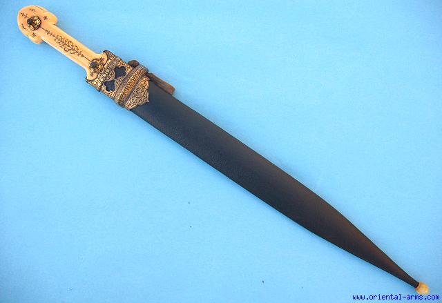 The scabbard tip is made of ivory. The total length is 19 3/4 inches. Excellent condition. Minor small dark spots on the blade. The back small by-knife is missing. A very good quality kindjal. |
