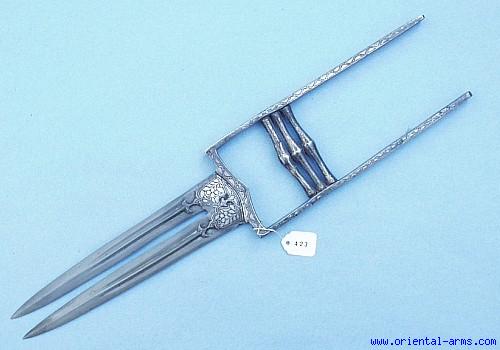 A fine double blade Kattar forged from Indian wootz (crystalline) steel and inlaid with silver koftgari work. The multiple blade Kattars with two or three blades are not so common as the single blade ones.