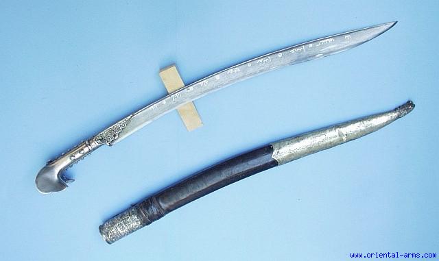 We offer for sale this very fine Balkan / Turkish Yataghan sword, with pattern welded (Damascus) blade, well forged in the pattern known as Turkish Ribbon: Bands of twisted steel ingots forged welded to a high Carbon steel edge. The blade is 23 inches long, lavishly marked and inscribed with true silver inlay on both faces of the blade. The handles are white metal. The scabbard is wood covered with leather stitched with the spiral pattern, with a heavy well chased and decorated silver locket and engraved white metal chape. The scabbard retains an old binding of the leather belt loop to the scabbard. Total length 31 inches. Very good condition. Minor damages and repairs to the grips and grip strap. |