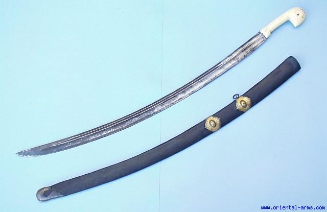 This fine Shashqa sword originates from the Caucasus, probably from Degasthan. It eas purchased in Jerusalem in 1918 and was in a private collection in the USA since than. The fine blade is 31 inches long, etched in Cyrillic letters: Weapons Factory of Osman Omarov. The maker name, Osman is also stamped on the other side of the blade between two eagles. The handle is carved from a single massive piece of walrus ivory. The scabbard is wood covered with black leather (recent) and mounted with gold inlaid steel fittings. Total length 37 ¨ö inches. Good condition. The lower part of the blade is blackened and with minor pitted spots. The walrus handle is probably a very early replacement, before the sword was collected in 1918. and the blade was slightly reshaped to accept the handle. The scabbard tip is pitted and most of its gold inlay is gone. A very fine piece. |