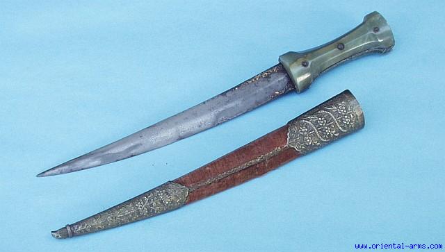 A fine Turkish dagger. 18 C or earlier, watered blade 10 inches long with traces of gold koftgari decoration. Jade grips with gilded brass grip strap. Later wood scabbard with chased brass fittings. Good condition. Age cracks in the jade grips and a forging flaw near the blade tip. |