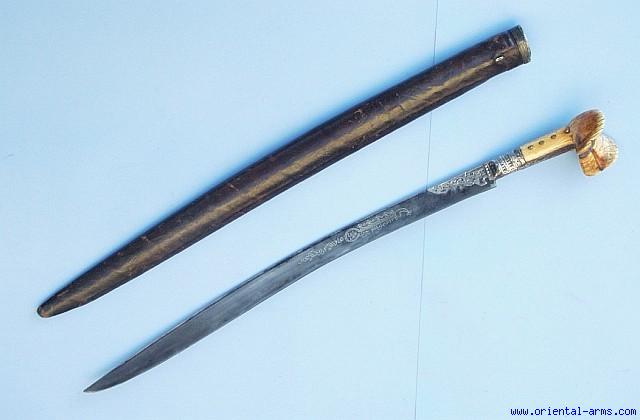 Up for sale is this good example of a Balkan Yataghan sword. Typical down curving blade, 22 inches long, decorated with true silver inlay work with inscriptions in Arabic letters, signed and dated to 1229 in the Islamic calendar . This refers to 1813 in the Gregorian calendar. The handle is composed of two massive grips slabs carved from elephant ivory with the classical huge pommel ears. The bolster and grip strap are chased silver. Wood scabbard with leather cover and small silver locket. . Total length (in scabbard) 31 inches. Very good condition . The right grip is repaired. |