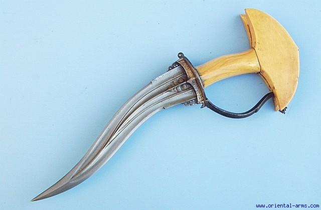 The Khanjarli, one of the rarest and most sought after dagger in the Indian weaponry. It is characterized by its strongly re-curving blade and wide lunette shaped pommel. This one is a very fine example, with 8 inches multi-fullered blade forged from fine wootz (Damascus) steel. The lunette shaped pommel and grips are Ivory, connected to the tang with concealed rivets. Total length 13 inches. Very good condition. Excellent age patina to the ivory with minor chips on the backside. . This piece comes with a recently made wood scabbard covered with colorful fabric. A very fine piece. |