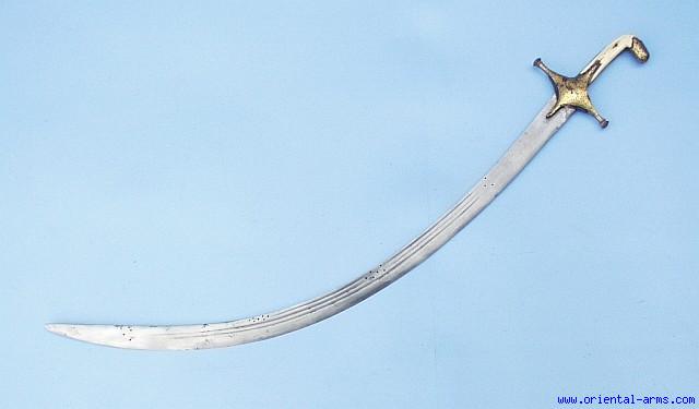 A fine wootz Shamshir with several Indian Characteristics such as the blade curvature, the fullers structure and the blade ricasso. The blade is 28 inches long, deeply curved and multi-fullered with 7 inches back edge and gold inlay marking. The grips are elephant ivory and the hilt fittings are richly gold inlaid as well. No scabbard. Total length 33 inches. Very good condition, with only very little of the gold decoration erased. Age signs on the grips. |