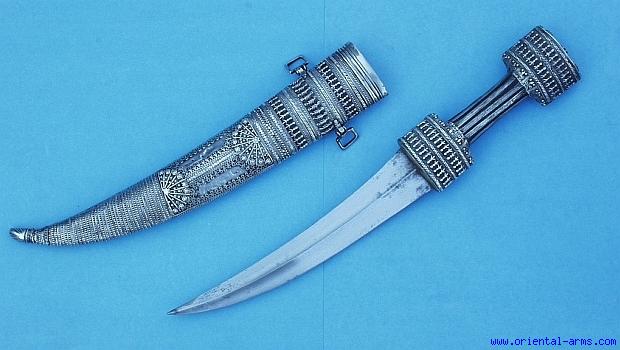 A dagger of superior quality and decoration, of Turkish origin, most probably late 19 Century. Good 11 inches curved blade with a central rib. Dark wood (or horn) hilt mounted with silver collar, pommel and grip strips. The scabbard is whole silver on wood, rich in filigree decoration of the utmost quality. Total length in scabbard 21 inches. Altogether good plus condition. You rarly see such a rich and splendid piece on the market. Priced accordingly. |