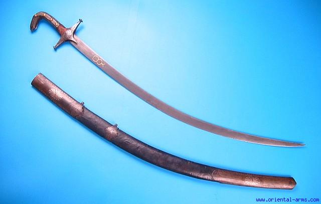 A very fine Shamshir from Syria. The blade is Persian, 18th Century, forged from top quality wootz (Damascus, watered steel), marked and signed with the maker sign and decorated with gold inlay work. It is 31 inches long, curved and single edged, most probably of Persian origin. The cross guard is steel decorated with Arabic inscription. The ‘Syrian’ attribution comes mainly from the shape of the hilt and the fitting decoration. The grips are horn inlaid with brass and lead dots and decorated with brass nails. The cross guard is secured to the grips with a twisted copper wire. The pommel is steel and it is sharply down curving (very typical Arab style). Wood scabbard covered with the original black leather stitched with spirals of brass wire (the correct and difficult to do manner). All scabbard fittings and cross guard are decorated with silver Koftgary. Very good condition. Minor edge nicks and darkened spots on the blade and some of the scabbard fittings koftgari is worn. A very fine piece. |
