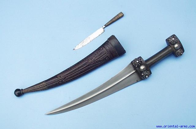 Up for sale is this Jambiya dagger from Kurdistan, which is very unusual in that that it contains a companion knife attached to it, in a compartment on the rear side of the scabbard. Similar attachments for companion utility knife can be found on various Islamic daggers and swords, but we have never seen one on a Kurdish Dagger. The blade, 10 ½ inches long, curved and double edged is forged from very fine Persian wootz steel, with very clear pattern. The I shaped handle is cut from a solid piece of black water buffalo horn and decorated with four big silver filigree buttons. The rivets bosses are made from old Turkish Coins (one missing). Wood scabbard with beautiful tooled leather cover and horn tip. The companion utility knife is single edged blade, 4 ½ inches long and grips made of horn. Total length (in scabbard) 18 inches. Very good condition. Old repair to the lower part of the scabbard. |