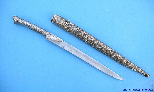 Up for sale is this small attractive Yataghan style Knife. Turkish origin, second half of the 19 C. 10 inches blade 16 inches total length, whire metal handle and scabbard entirely chsed. Very good condition. Old repair to the scabbard tip. Very low price for quality. |