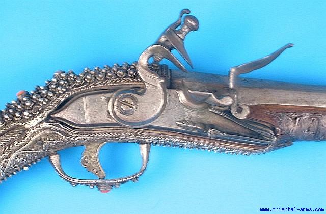 A very fine piece, this Turkish flintlock pistol is decorated entirely with silver filigree work, set with light color corals and inscribed and dated in niello work. 12 inches barrel, 19 ½ inches total length, very good condition. A treasure. |