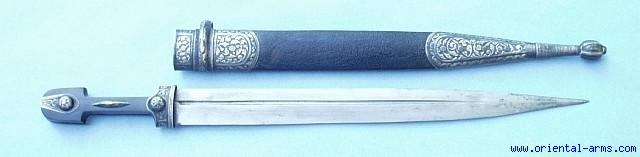A very good Kindjal. 13 ½ inches blade with off-centered fuller. The hilt is of typical form; the tang is an integral extension of the blade and the grips are black horn riveted to the tang with three decorated silver rivets. The scabbard is wood covered with the original black leather and mounted with silver fittings nicely engraved and decorated with niello enamel and marked with the Russian silver hallmark ‘X84’. At the backside of the scabbard there is a compartment for a small by-knife, which is now missing. There are minor pitted spots at the blade tip and a minor damage to the leather at the scabbard back but otherwise all is in very good plus condition. All parts are old and original, no restored or replaced parts. |