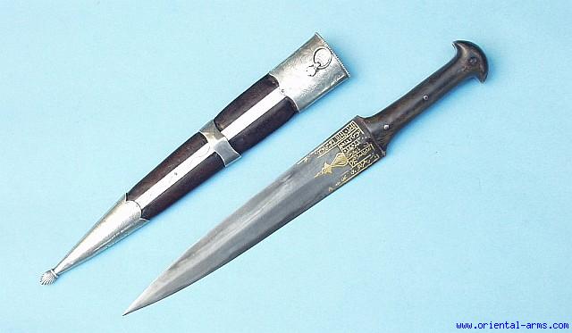 This Fine dagger is also known as Ottoman Court Dagger. it was a side arm of the nobilities visiting the courts of the Ottoman empire in the 17 and 18 C. The blade is 11 inches long of flat diamond cross section, forged from fine pattern welded (Damascus) twisted steel. The blade is inlaid with gold koftgari Arabic inscriptions and dated 1284 (1857 in the Gregorian Calendar). The grips are horn. The scabbard is wood covered with leather Engraved silver locket and chape. Total length (in scabbard) 18 inches. Very good condition. |