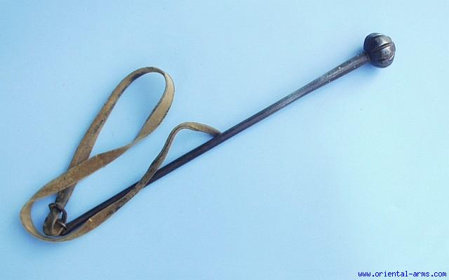 Up for sale is this very nice and rare item: An old Chinese mace, probably late 18 or early 19 C, with a ribbed rounded head, 2 inches in diameter and 1 ½ inches tall. The 17 inches haft is forged in one piece with the head. It is of a square cross section at the top 3 inches and rounded for the rest to the tip. It is decorated with engraved lines and dots in geometrical pattern. The head flanges and the top of the haft are inlaid with gold dots (several missing). The tip of the haft is flattened and a a 34 inches long heavy leather strip is connected to it with a steel ring. Very good condition to age. The leather strip is later to the mace, probably mid 20th C. |