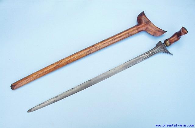 An Execution Keris dagger / sword from Sumatra. This rare type of Keris was used to execute criminals. The long narrow blade was inserted above the collarbone of the sitting executed person and pushed down directly into the heart, causing instant death. The blade of this specific Keris has 20 inches blade, narrow but sturdy and with acute tip. The hilt is typical style grained wood with a brass mendak (the small metal ring/fitting below the hilt). The scabbard is wood. Total length 25 inches. Very Good condition Minor blackened spots on the blade. An age crack on the hilt ( but hold solid). All parts original. A good solid piece at a very reasonable price. |