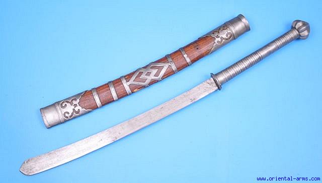 A very unusual Dah sword, with characteristics and dimensions of a Laos Dah but with Chinese marking and use of Chinese common materials. Spatula shaped blade, 18 ½ inches long with a clear Chinese marking. Handle and scabbard fittings made from Pewter, Wood scabbard. Total length 30 inches. Very good condition. |